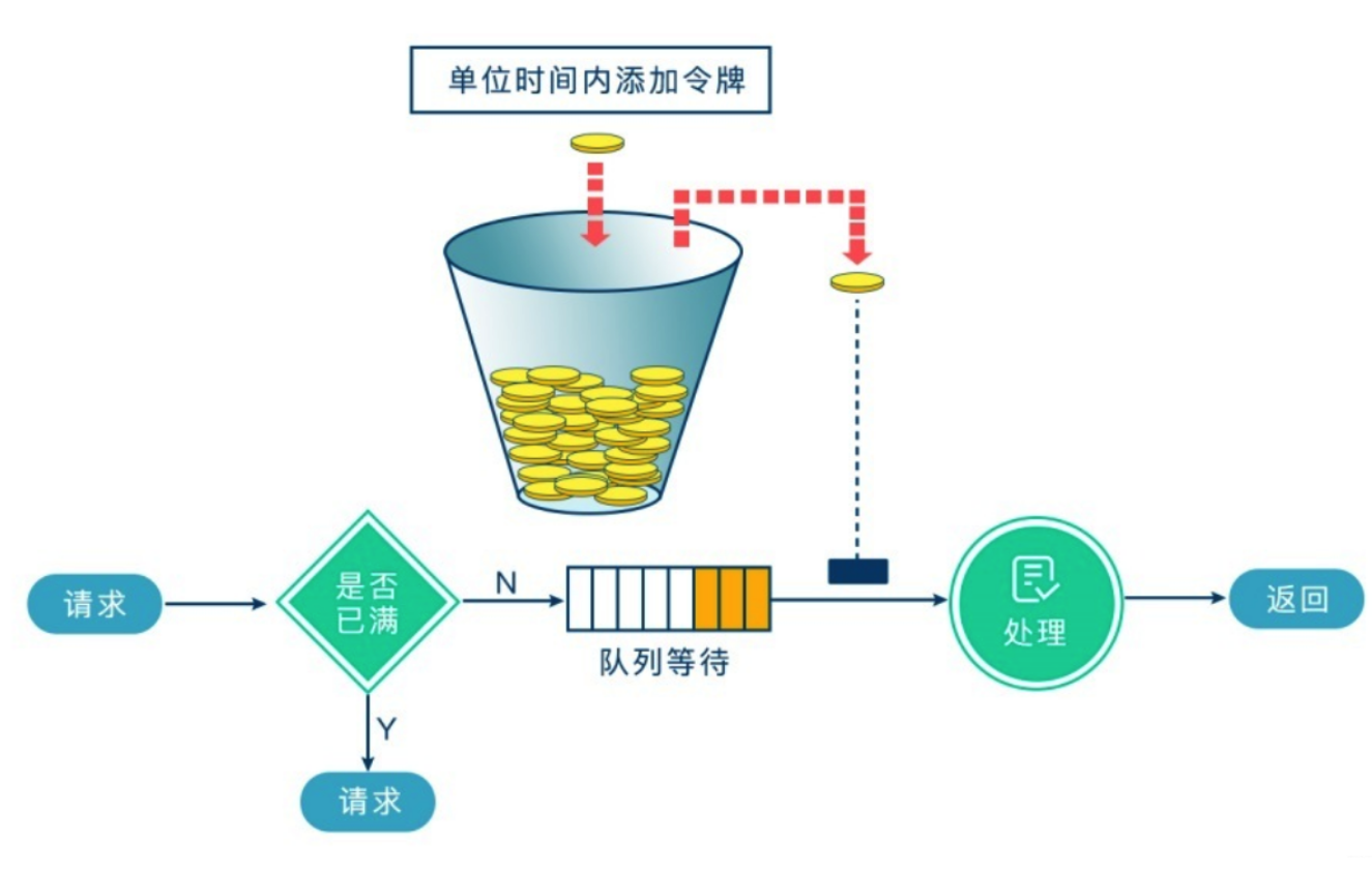令牌桶算法是一个存放固定容量令牌的桶,按照固定速率往桶里添加令牌。