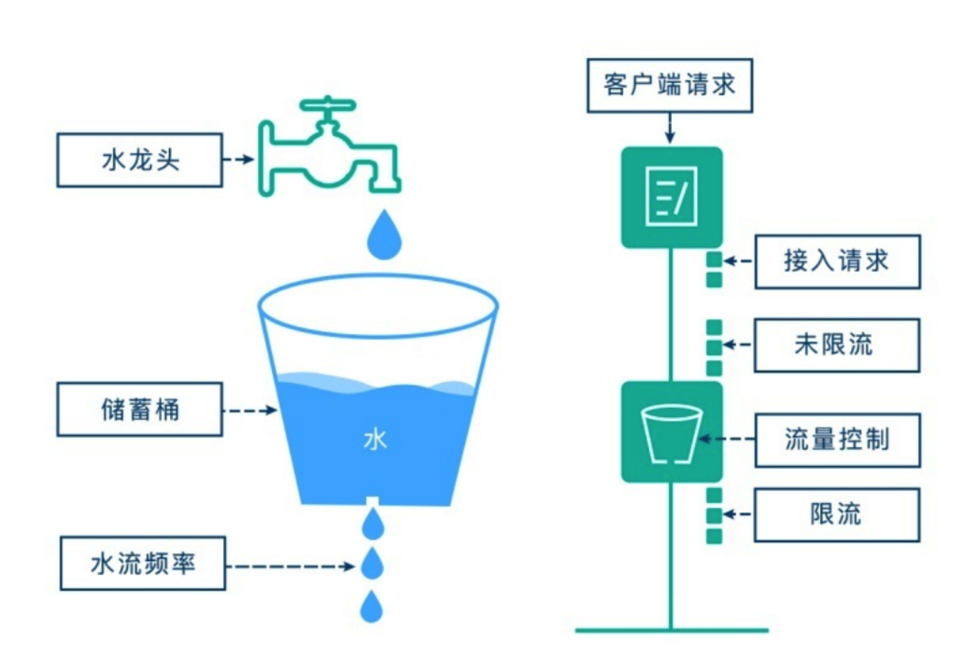 如果流入水滴超出了桶的容量,则流入的水滴溢出了(被丢弃),而漏桶容量是不变的。
