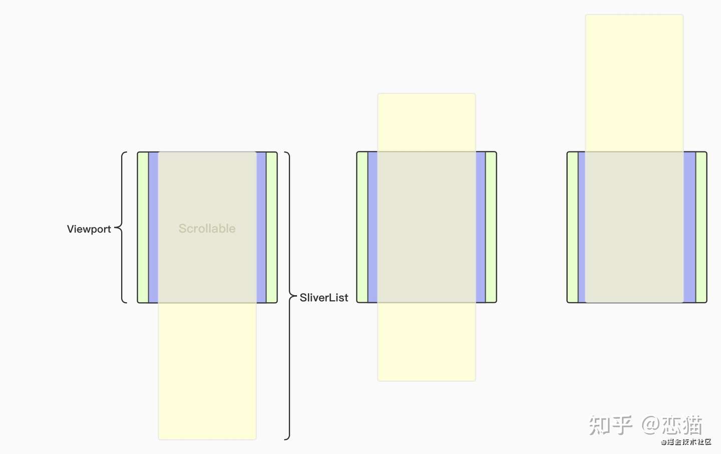 Viewport: 它是一个 MultiChildRenderObjectWidget 的控件 ,「它提供的是一个“视窗”的作用,也就是列表所在的可视区域大小;」Scrollable:「它主要通过对手势的处理来实现滑动效果」 ,比如VerticalDragGestureRecognizer 和 HorizontalDragGestureRecognizer;Sliver: 准确来说应该是 RenderSliver, 「它主要是用于在 Viewport 里面布局和渲染内容;」