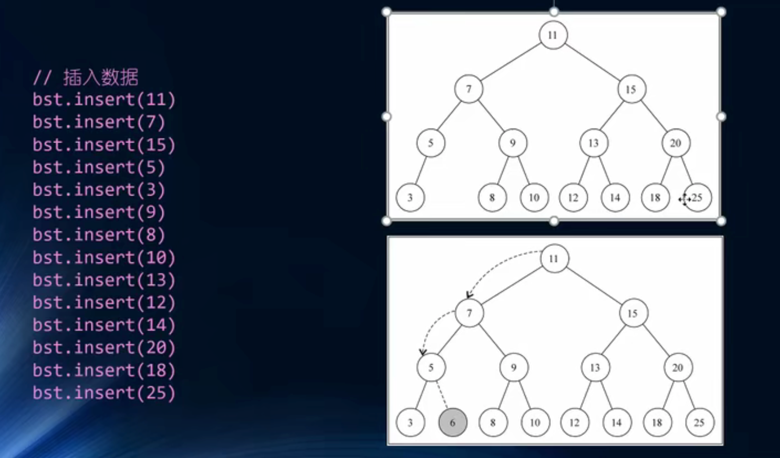 - 然后判断根节点是否存在,不存在时通过:this.root = newNode,直接把新节点作为二叉搜索树的根节点。