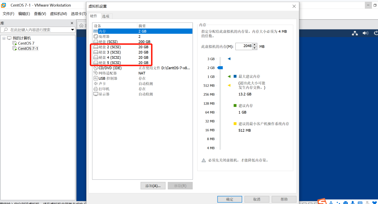 step1:环境准备:raid5至少需要三块硬盘,因此在虚拟机中,增加4块硬盘,其中三块用来做活动盘,一块用来做热备盘