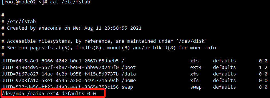 [root@node02 ~]# echo "/dev/md5 /raid5 ext4 defaults 0 0" >> /etc/fstab