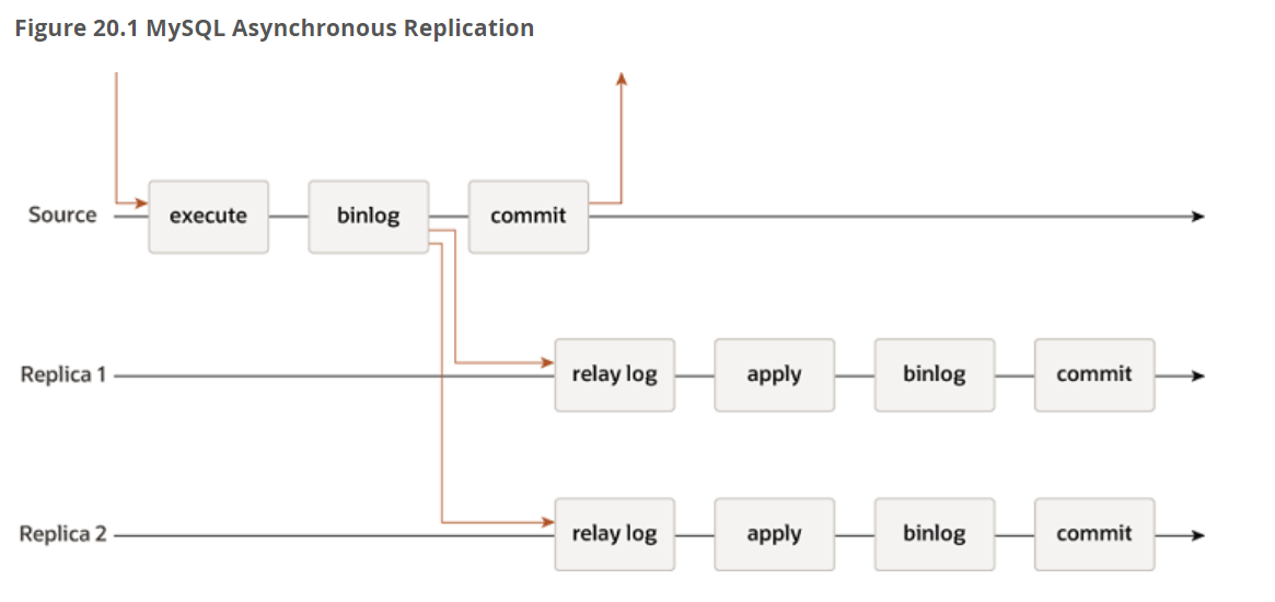 传统的MySQL复制提供了一种简单的从源到副本的复制方法。源是主要的,有一个或多个副本是次要的。源应用事务,提交事务,然后稍后(因此异步)将其发送到副本,以重新执行(基于语句的复制)或应用(基于行的复制)。这是一个无共享系统,默认情况下,所有服务器都有数据的完整副本。如下图所示