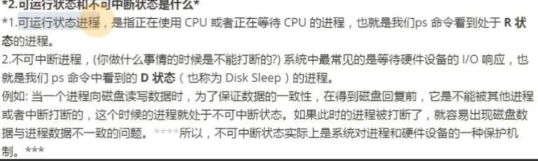 - 在得到磁盘回复前,它是不能被其他进程或者中断打断的,这个时候的进程就处于不可中断状态