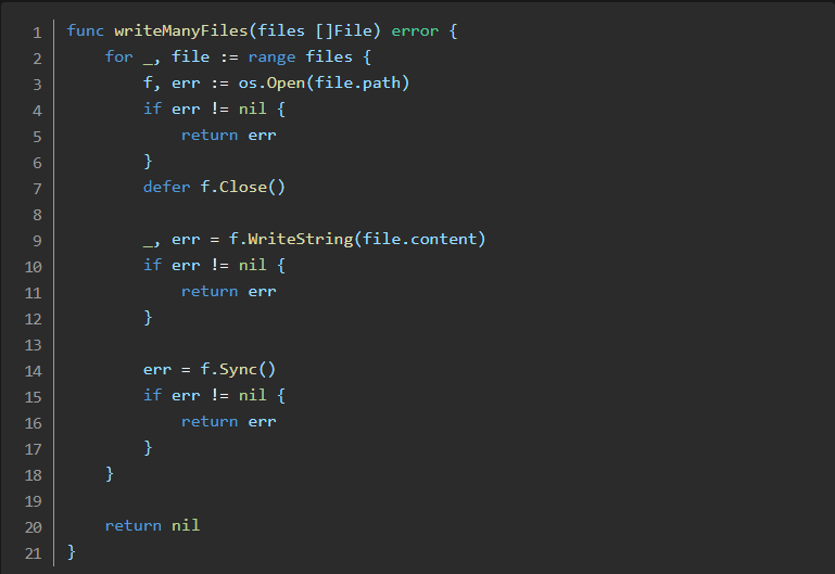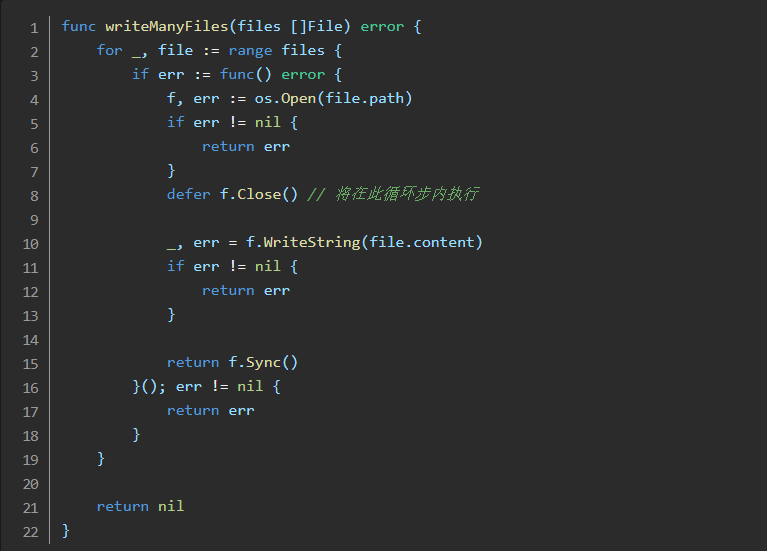 在 writeManyFiles 函数中,defer f.Close() 语句在循环的外部,这意味着即使在遇到错误后,文件描述符仍然会保持打开状态,直到整个循环完成。这可能会导致文件描述符长时间占用,尤其是在处理大量文件时。