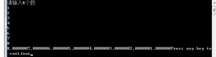 #include<stdio.h> main(){ int i; double a[8]; printf("请输入8个数\n"); for(i=0;i<8;i++) scanf("%lf",&a[i]); for(i=7;i>=0;i--) printf("%f",a[i]); }![]()