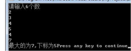 #include<stdio.h> main(){ int a[6],i,max,maxidx; printf("请输入6个数\n"); for(i=0;i<6;i++){ scanf("%d",&a[i]); if(a[i]>max){ max=a[i]; maxidx=i; } }printf("最大的为%d,下标为%d",max,maxidx); }![]()