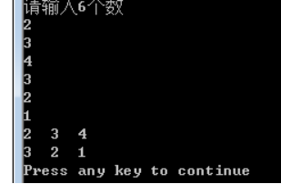 #include<stdio.h> main(){ int a[2][3],i,j; printf("请输入6个数\n"); for(i=0;i<=1;i++){ for(j=0;j<=2;j++) scanf("%d",&a[i][j]); }for(i=0;i<=1;i++){ for(j=0;j<=2;j++) printf("%-3d",a[i][j]); printf("\n"); } }![]()