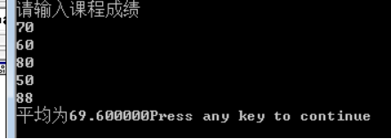 #include<stdio.h> main(){ int a[5],i; float avg=0; printf("请输入课程成绩\n"); for(i=0;i<5;i++){ scanf("%d",&a[i]); avg+=a[i]; } avg/=5.0; printf("平均为%f",avg); }![]()