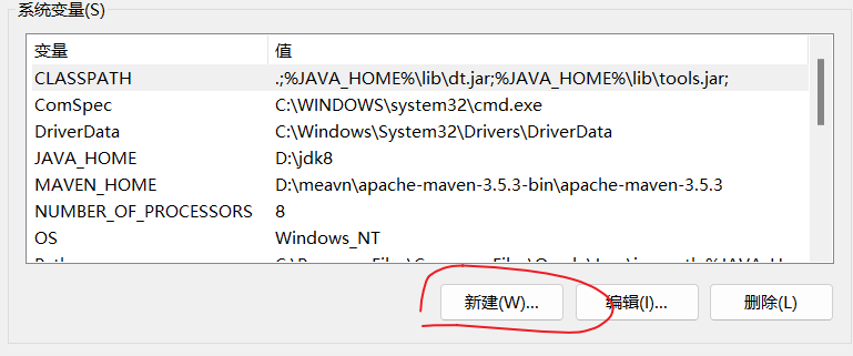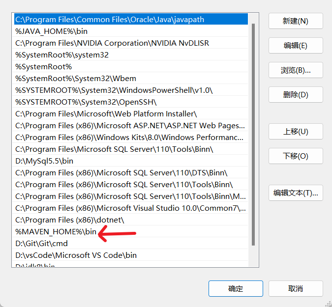 点击path变量,点击编辑,或者双击path,进入编辑页面,添加此条数据,maven的环境变量配置完毕