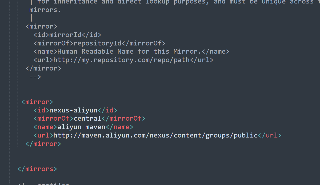 找到<mirror></mirror>标签,将阿里镜像的地址覆盖粘贴。