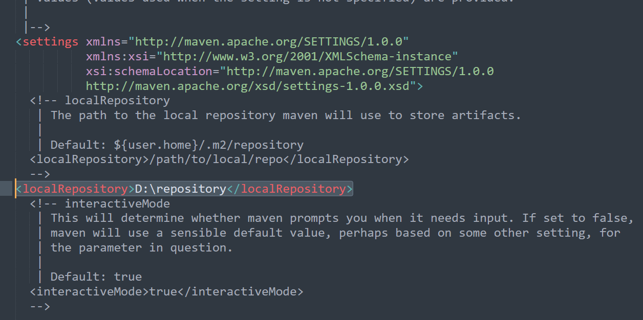 在<localRepostiory>标签中填写本地仓库的地址<localRepository>D:\repository</localRepository>。