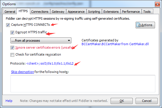 在Tools->Options切换到Tab页HTTPS,勾选下图中箭头指向的复选框,并确认是否缺少协议,若缺少默认的协议,则增加,如缺少;tls1.2,注意分号间隔。
