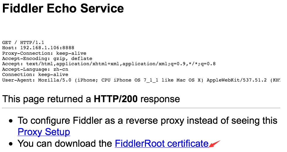 设置完代理后,打开手机浏览器,地址输入:PC的IP地址:8888(如10.66.88.101:8888),点击最下边的FiddlerRoot certificate,确认安装。
