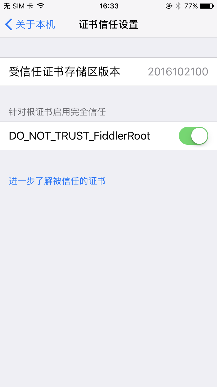 IOS手机安装完证书后,在设置->通用->关于本机->证书信任设置,找到刚安装的证书,并打开,如下图。