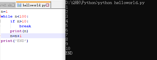 本来可以打印1-99,但在n=11时,退出出循环,所以只打印了1-10