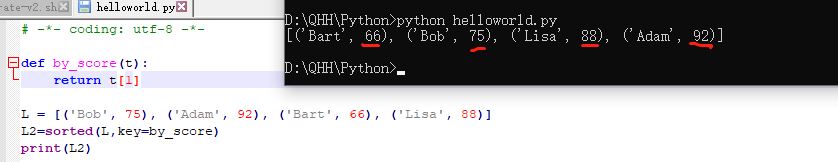 sorted()函数也是一个高阶函数,它还可以接收一个key函数来实现自定义的排序 ,例如按绝对值大小排序,按照ASCII的大小排序,按照首字母排序,按照首字母倒序排序
