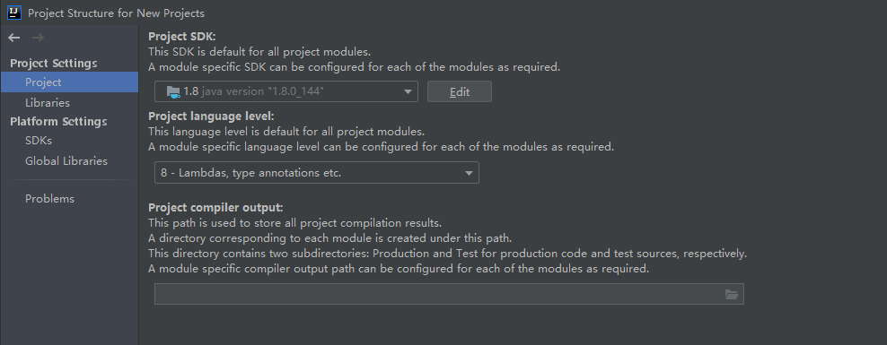 2.2、该项为附带,同时可以为新工程设置jdk环境,File -->Settings for New Project-->Structure for New Project