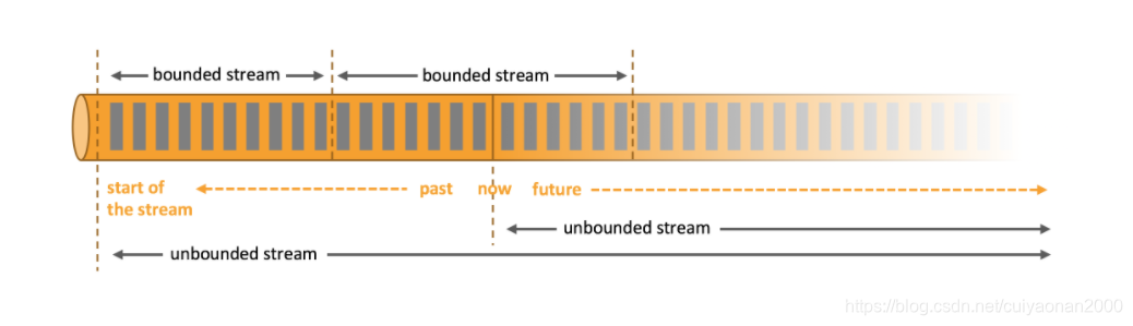 在自然环境中,数据的产生原本就是流式的。无论是来自 Web 服务器的事件数据,证券交易所的交易数据,还是来自工厂车间机器上的传感器数据,其数据都是流式的。但是当你分析数据时,可以围绕 有界流(bounded)或 无界流(unbounded)两种模型来组织处理数据,当然,选择不同的模型,程序的执行和处理方式也都会不同。(如下图所示演示数据流的图像定义)