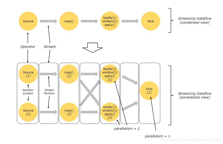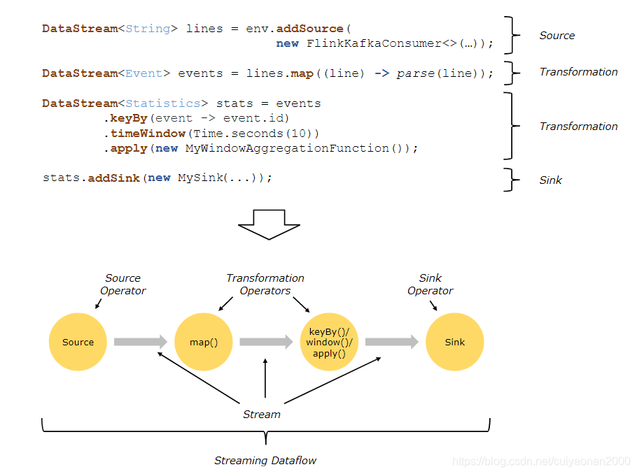 通常,程序代码中的 transformation 和 dataflow 中的算子(operator)之间是一一对应的。但有时也会出现一个 transformation 包含多个算子的情况,如下图所示。(算子即我们的处理数据流的程序)