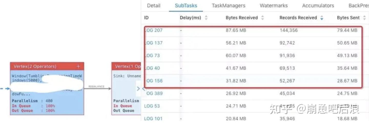 Flink Web UI 自带Subtask 接收和发送的数据量。当 Subtasks 之间处理的数据量有较大的差距,则该 Subtask 出现数据倾斜。如下图所示,红框内的 Subtask 出现数据热点。