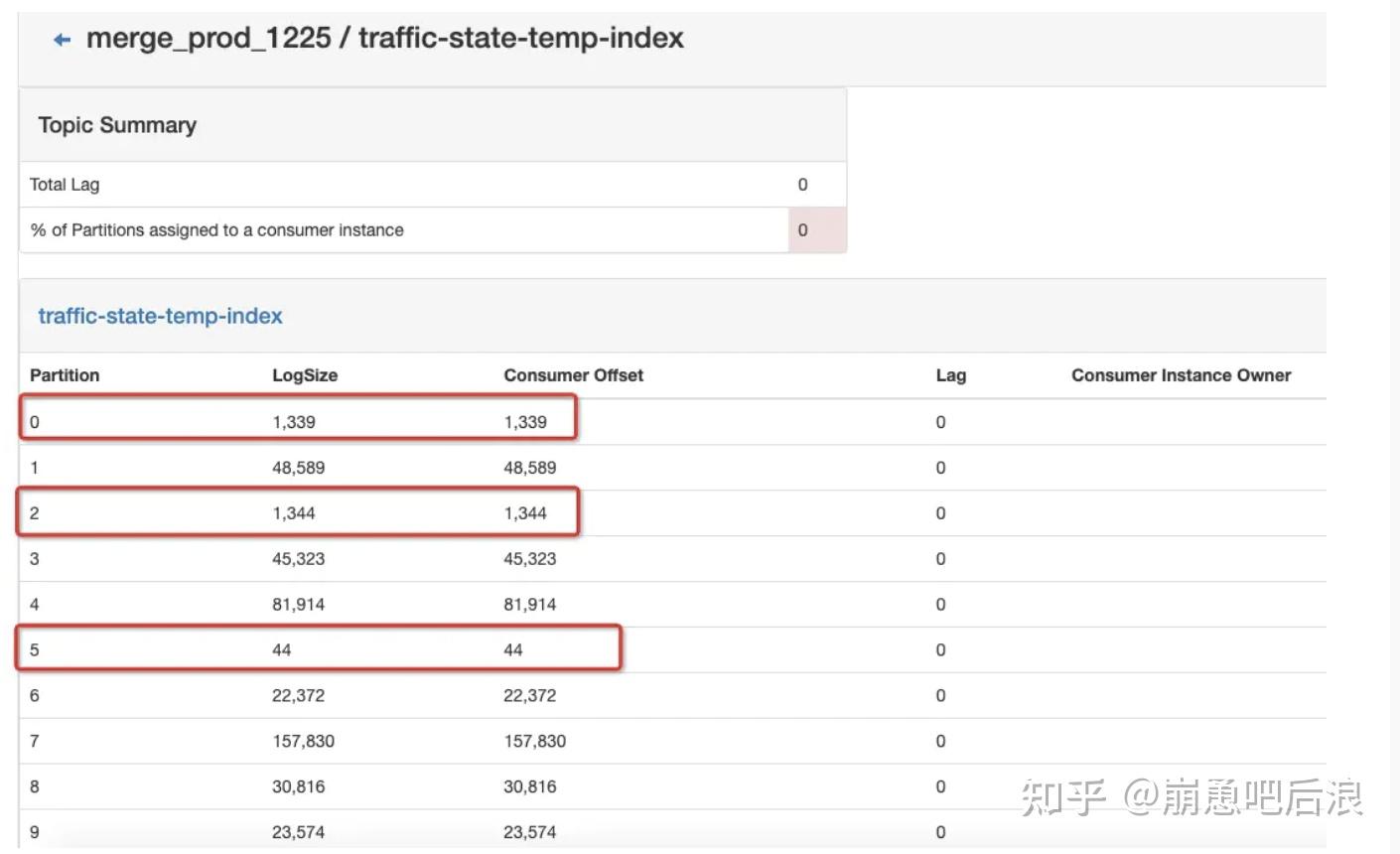 打开kafka监控,可以看到数据有严重的倾斜问题。如下图所示,10个分区中有三个分区数据量特别少,5号分区基本上没数据。