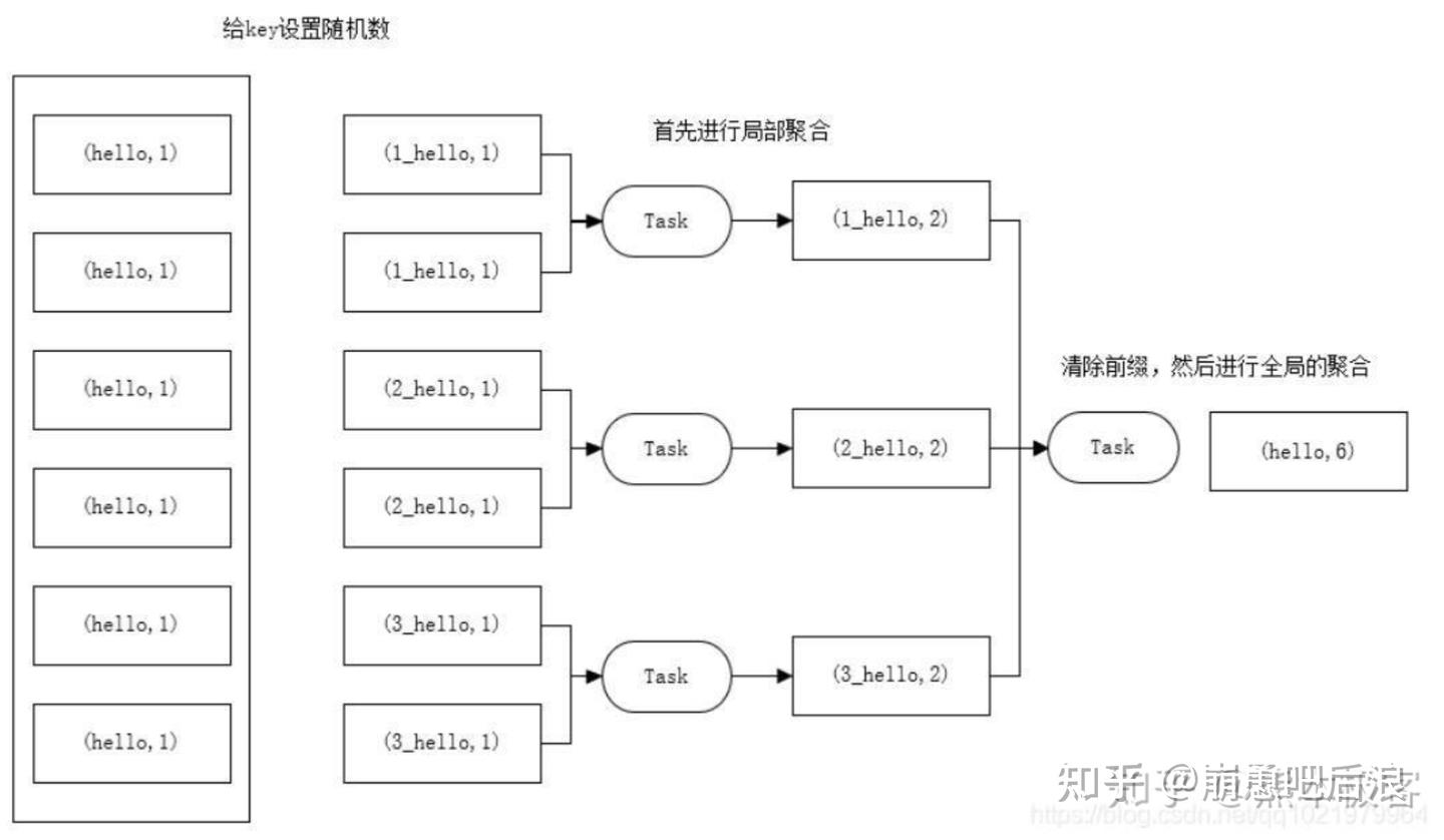 在每个节点本地对相同的 key 进行一次聚合操作,类似于 MapReduce 中的本地 combiner。map-side 预聚合之后,每个节点本地就只会有一条相同的 key,因为多条相同的 key 都被聚合起来了。其他节点在拉取所有节点上的相同 key 时,就会大大减少需要拉取的数据数量,从而也就减少了磁盘 IO 以及网络传输开销。 两阶段聚合的具体措施:
