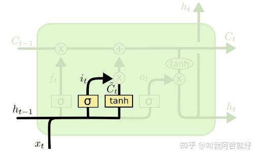 现在需要传递给单元状态的新信息是前一个时间戳 t-1 处的隐藏状态和时间戳 t 处的输入 x 的函数。
