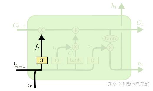 随后,对其应用 sigmoid 型的激活函数。这将 f_t 压缩映射 成为 0 到 1 之间的数字。稍后将此f_t与前一个时间戳的单元状态相乘,来判断上一时刻单元所携带的信息,是否应该忘记?应该忘记多少?如下所示: