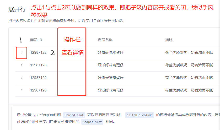通过设置 type="expang" 和 scoped slot 可以开启展开行功能, el-table-column 的模板会被渲染成为展开行的内容,展开行可