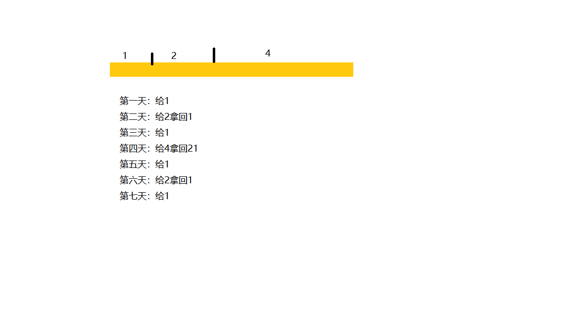 1.你让工人为你工作7天,给工人的回报是一根金条。金条平分成相连的7段,你必须在每天结束时给他们一段金条,如果只许你两次把金条弄断,你如何给你的工人付费?