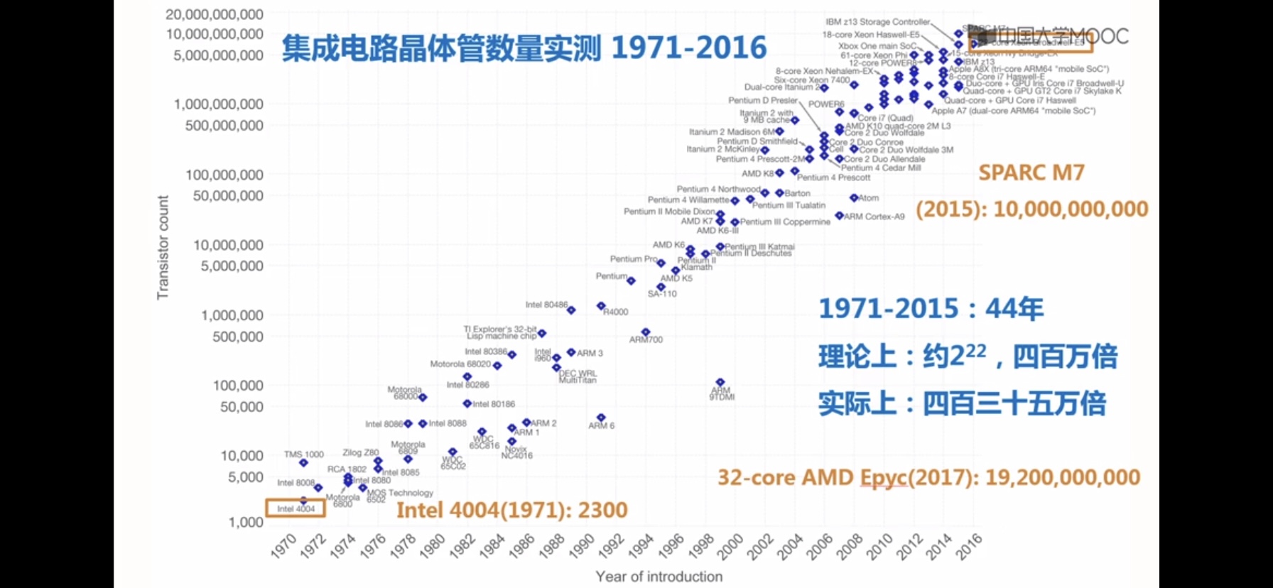在程序设计基本方法一节中我了解到了有关计算机的发展如计算机是呈摩尔定律的态势发展至今,从1971年Inter的4004处理器到2017年的AMD(32核处理器),计算机几乎单位面积集成电路上可容纳晶体管数量约每两年翻一番,这个数据之庞大是我在之前的学习中没有料到的,这也让我明白了计算机这个行业的可持续发展性以及发展潜力。