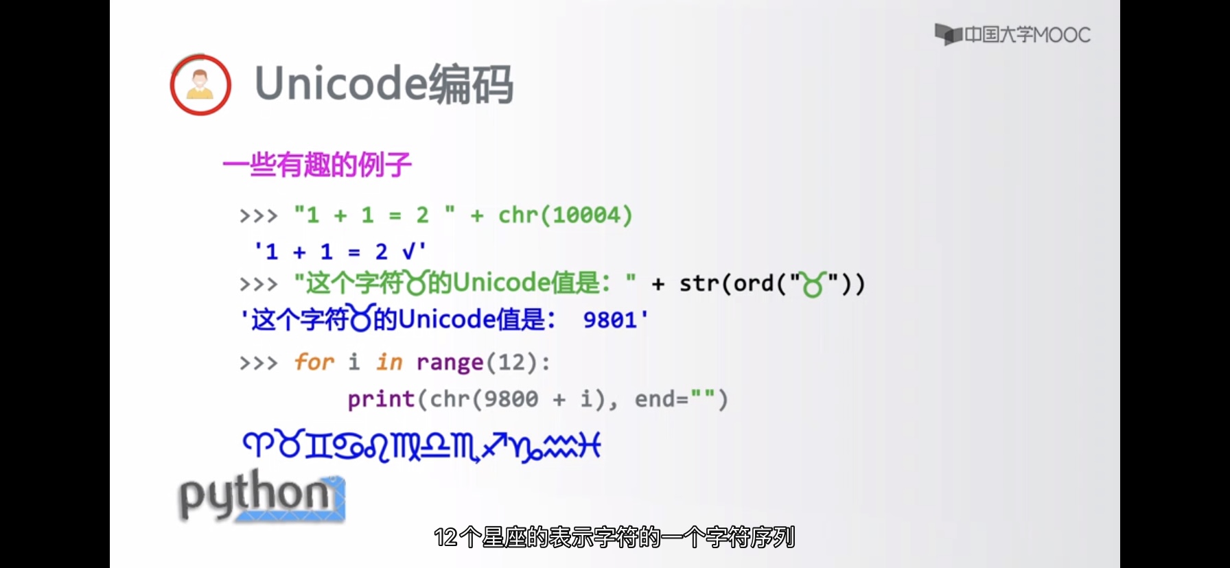 chr(u)u为Unicode编码(python字符串编码方式),返回其对应字符;ord(x)x为字符,返回其对应的Unicode编码,Unicode编码作为统一字符编码,即覆盖几乎所有字符的编码方式,所以得以通用