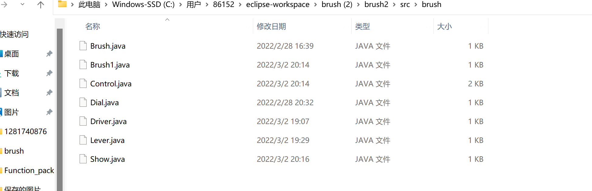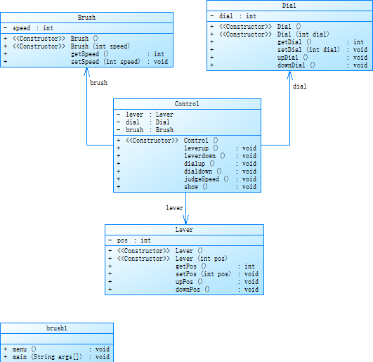 对比于第一次的单一类,明显第二次的类更加丰富以及分工明确,brush1是主类也就是实体类,Control类、Driver类以及Show类都是接口类,Dial类、Brush类、Lever类都是业务类,虽然对单一职责原则并没有做到十分的完善,但是也算是有所领悟。