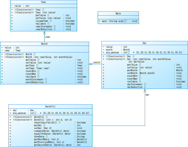 第一次所做的PTA作业是有一定难度的,主要是关于日期的计算,从DateUtil中调用Day类的方法,再继续从Day类中调用Month的方法,以下是我的类图: