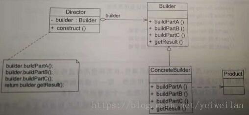 建造者模式分为抽象建造者(Builder)、具体建造者(ConcreteBuilder)、产品角色(Product)和指挥者(Director)。Builder类中一般声明两类方法,一类方法是BuilderX(),他们用于创建复杂对象的各个部件,另一类方法是getResult(),用于返回复杂对象。它可以是抽象类,也可以是接口。ConcreteBuilder类用于实现Builder接口;Product类中包含多种组成部件;Director类中运用constract()建造方法调用建造者对象的部件构建与装配方法完成复杂对象的建造。
