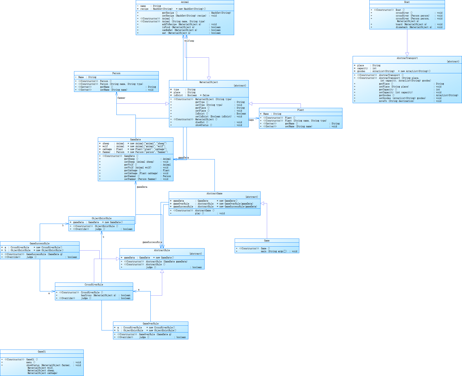 农夫过河练习还在持续,类的数量也越来越多,十分考验我们的继承和多态的基础,在农夫过河的持续练习中,学到了很多,一个游戏从简单的输入输出到后来的类设计,这个过程是艰辛的也是充满挑战的,接下来看看农夫过河变化的类图吧: