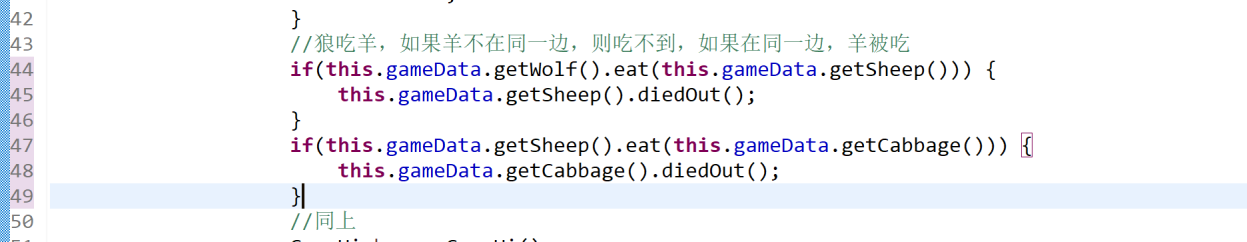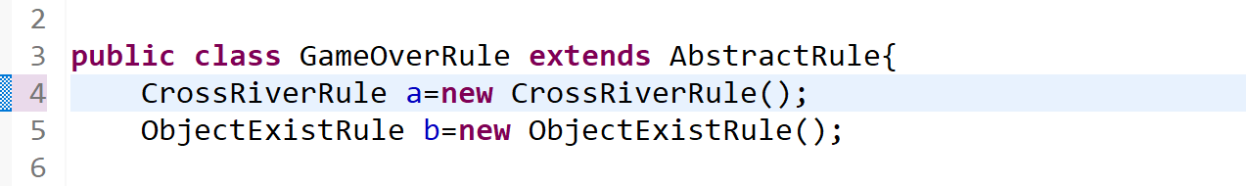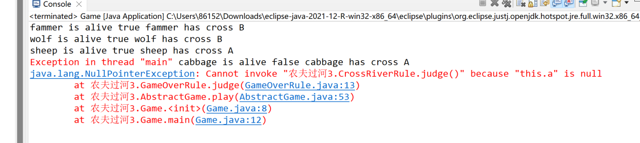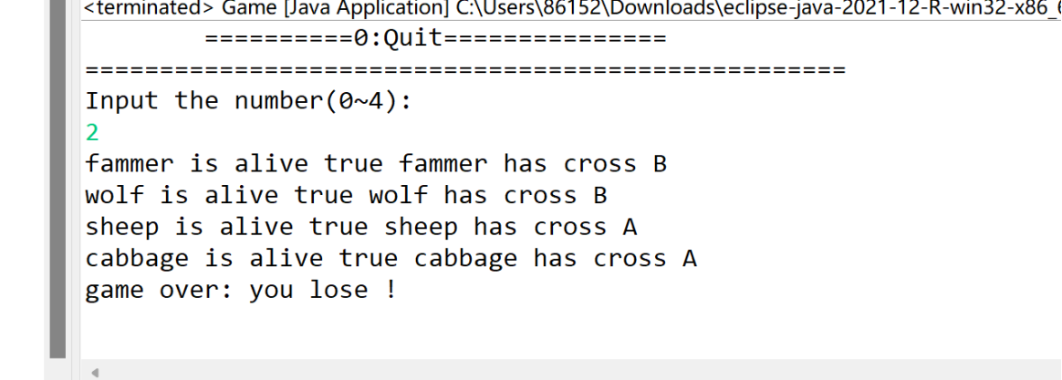 这是第四次农夫过河的类图,显然比第一次的农夫过河复杂,但同时耦合程度也较低,降低耦合度的方法又有:(1)少使用类的继承,多用接口隐藏实现的细节;(2)模块化尽可能单一,功能单一的模块其他模块调用的机会就少,也就是说,高内聚低耦合。在农夫过河的多次实验中,我意识到了MVC模式的重要应用,也同时在实验时遇到了不少错误,例如:开始,我将原本给出的类图以及解释搭好了一个框架,而后再进行各部分的继承的实现以及调试改错,在调试的过程中,我遇到了只声明对象没有创建对象的错误,以及对各个动物行为的不明确分析和对判断游戏是否结束情况的判断错误,导致游戏提前结束: