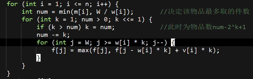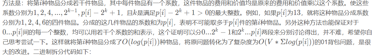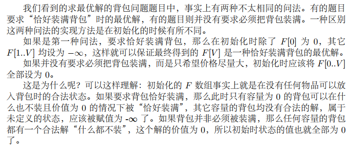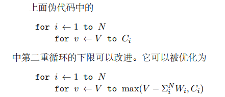 即后面(i…n)的所有物品都被装入背包后,剩余的空间仍然比 Ci 大。考虑到f[j]定义为容量为j的背包,装入前i种物品(不需要装满)的最大价值。若剩余空间比ci大,则此时f[ci]....f[v-sum(wi+1.....wn) - 1]是影响不到最终状态f[v]的,故无需更新,因为容量越大的背包装下的肯定更大,所以只需处理到f[v-sum(wi+1.....wn) - 1], 若需要装满则更不需要了,因为同理是取不到那些值的