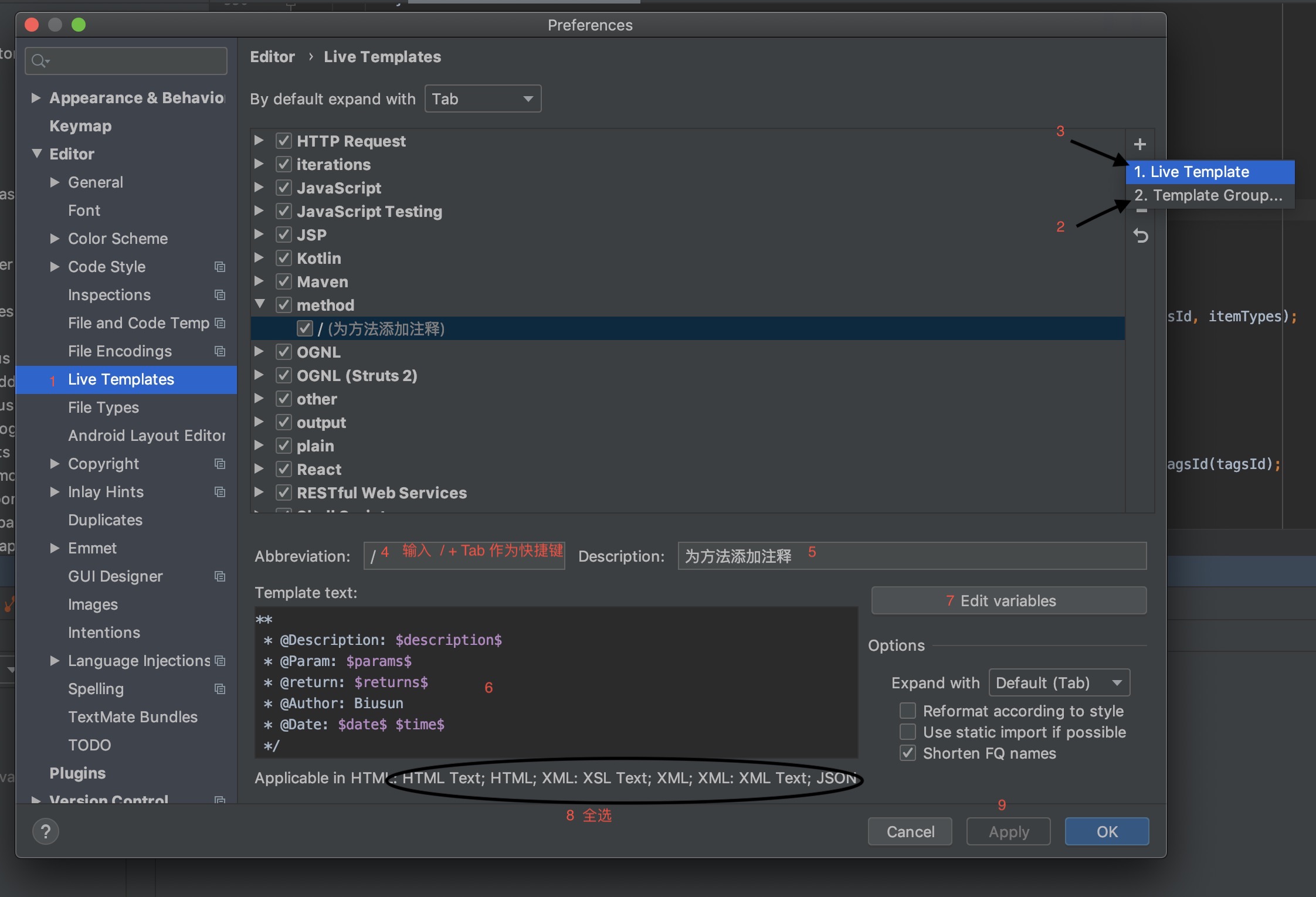 1、Live Templates -> 点击右边加号为自己添加一个Templates Group -> 然后选中自己的Group再次点击加号添加 Live Templates