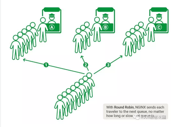 默认情况下采用的策略,将所有客户端请求轮询分配给服务端。这种策略是可以正常工作的,但是如果其中某一台服务器压力太大,出现延迟,会影响所有分配在这台服务器下的用户。