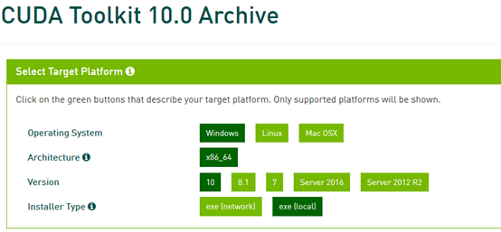 我要下载cuda10.0,网址是https://developer.nvidia.com/cuda-10.0-download-archive?target_os=Windows&target_arch=x86_64&target_version=10&target_type=exelocal