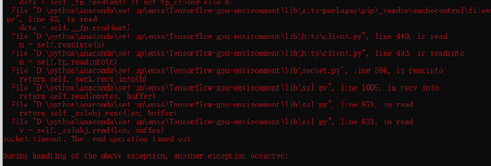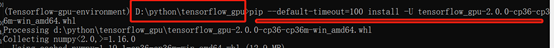 所以改成了将安装包下载到本地安装,pip install XXX.whl,因为超时所以要延长超时时间--default-timeout=100,pip命令pip --default-timeout=100 install -U tensorflow_gpu-2.0.0-cp36-cp36m-win_amd64.whl