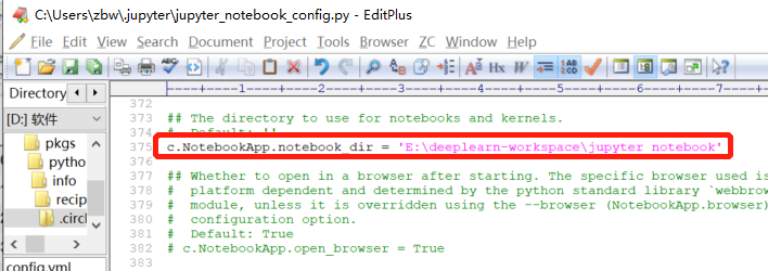 - 找到 # c.NotebookApp.notebook_dir = '',去掉该行前面的“#”(注意:这行前面也不能有空格哦);在打算存放文件的位置先新建一个文件夹(很重要,最好是英文的),然后将新的路径填在单引号中,保存配置文