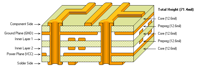 A:(S01-G02-S03-S04-P05-S06):此方案有4个布线层与2个参考平面,布线空间比较多,但是电源与地平面之间存在两个信号层,所以电源内阻相对比较高。由于第3层靠近地平面且在内层,所以关键的高速信号线应优先安排在此层。当然,S03与S04应该尽量垂直交叉布线,以最大限制避免相邻布线层的串扰。