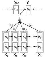 预测目标词$o_{i}$的权重系数向量矩阵$c_{i-1}=\alpha_{i 1} h_{1}+\alpha_{i 2} h_{2}+\cdots+\alpha_{i t} h_{T}$,$\alpha_{i t}$计算方法如下: