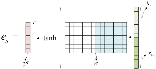 其中V和W是参数矩阵,通过训练数据的训练学习所得,j的取值范围为[1,$T_{x}$],$T_{x}$表示输入序列的长度,$h_{j}$表示编码器中的隐藏状态,$s_{i-1}$表示译码器中目标词$o_{i}$之前的所有预测的得到的译文信息。$h_{j}$和$s_{i-1}$的维度为$\mathrm{m} \times 1$,W的维度为$\mathrm{m} \times 2 \mathrm{~m}$,V的维度为$\mathrm{m} \times 1$,$V^{T}$的维度为$1 \times \mathrm{m}$