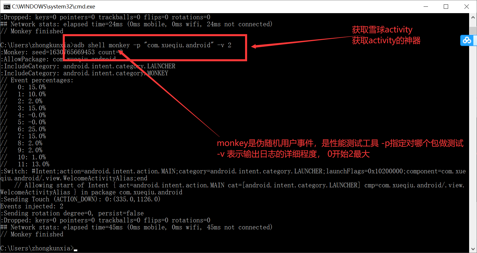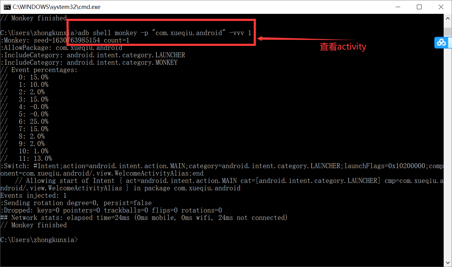 adb shell monkey -p “com.xueqiu.android” -vvv 1