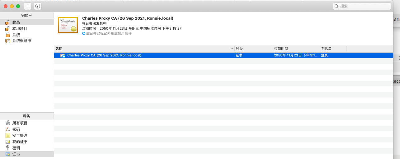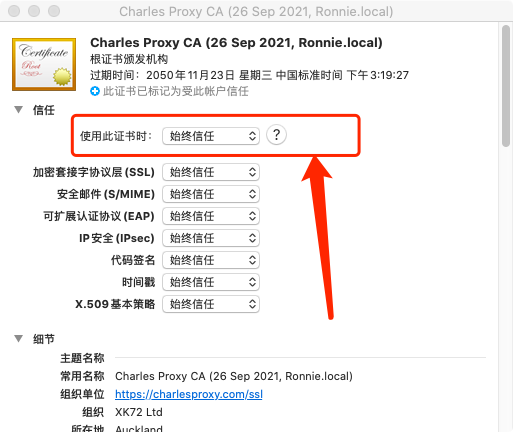 1. 安装证书,但是mac默认是不信任的, 安装完成会提示是未信任证书,双击证书。选择始终信任