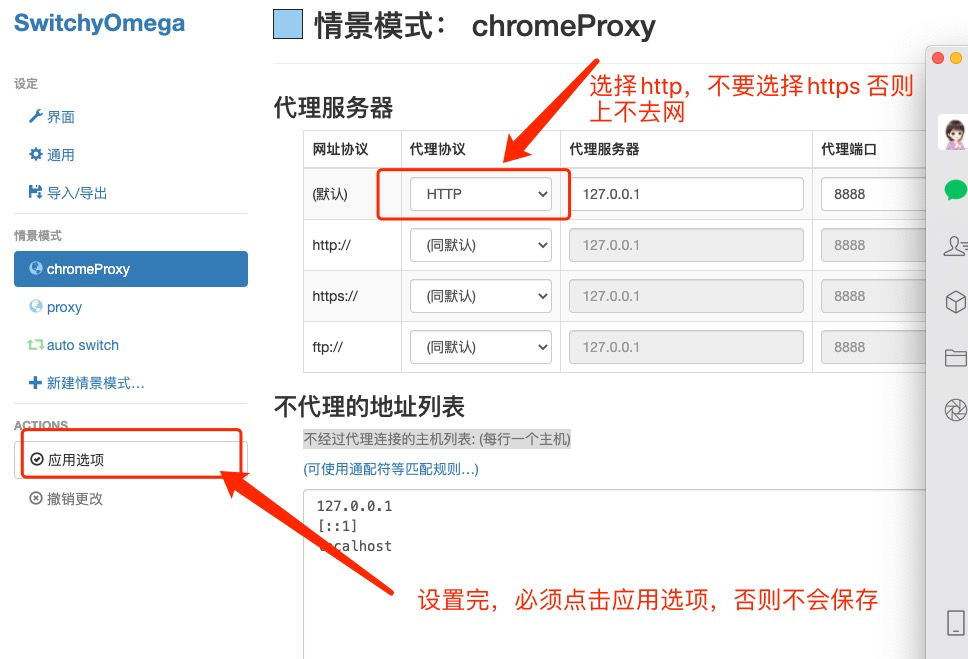 2. chrome配置 switchyomega 代理的时候,代理配置未点击。应用选项,导致配置不生效,刷新就没有了